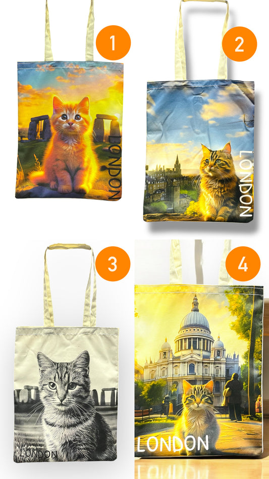 Cute Cat Print Tote Bags,London Cat Art Bag,Reusable Shopping Bag with Cats,Eco-Friendly Cat Canvas Bag,Stonehenge Cat Bag For Animal Lovers,Valentine’s Day Gift For Her