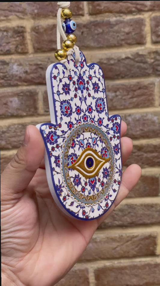 Hamsa Wall Hanging Blue Eye Ceramic Gold Charm, Good Luck Amulets 🪬 Wall Art,Home Decor,Fatima Hand